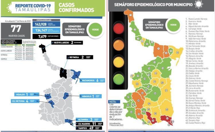 La Secretaría de Salud de Tamaulipas notificó 77 nuevos casos de COVID-19 y 7 fallecimientos durante la jornada de este lunes, por lo que reiteró el llamado a completar el esquema de vacunación para continuar con el descenso de casos y seguir avanzando a la nueva realidad.