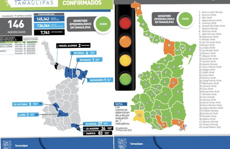 CIUDAD VICTORIA, TAMAULIPAS.- Tamaulipas cerró la jornada de este sábado con 146 casos de COVID-19 y 5 fallecimientos asociados a complicaciones graves, informó la Secretaría de Salud luego de pedir a la población fortalecer las medidas de seguridad sanitaria para evitar un rebrote de la enfermedad.