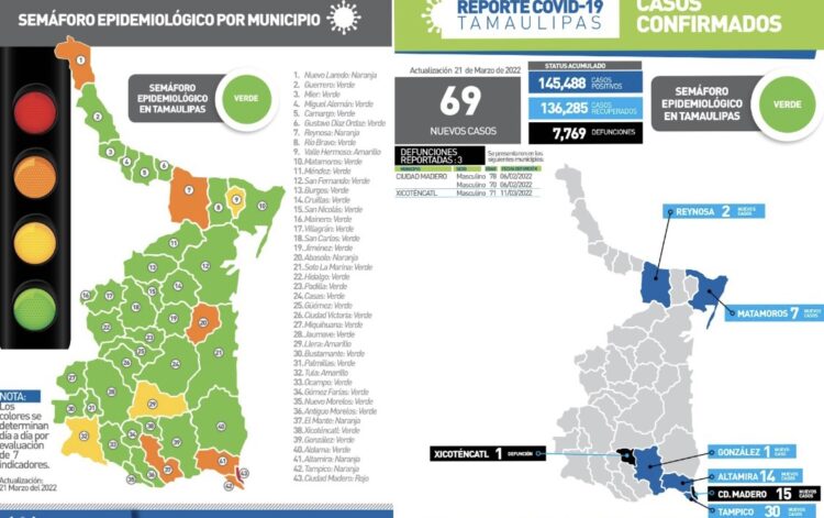 Ciudad Victoria, Tamaulipas.- Tamaulipas cerró la jornada de este lunes con 69 positivos a COVID-19 y 3 defunciones en pacientes con comorbilidades y aunque continúa en semáforo epidemiológico color verde, es fundamental reforzar las medidas de seguridad sanitaria para cortar la cadena de transmisión del virus.