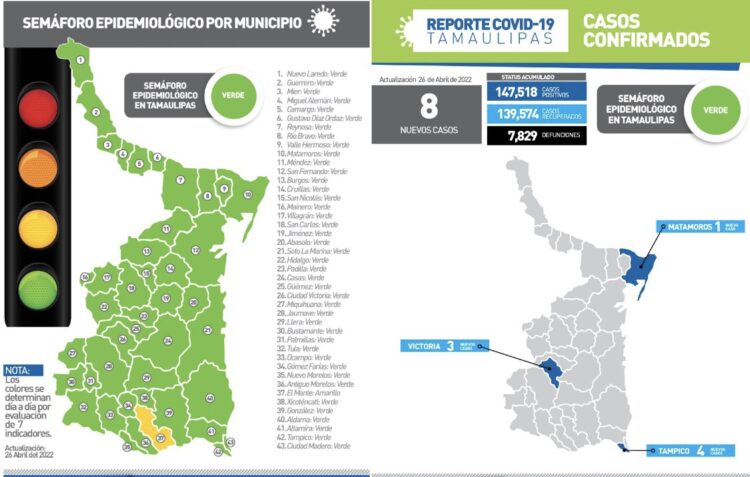Ciudad Victoria, Tamaulipas.- En su reporte técnico sobre el estado de la pandemia, la Secretaría de Salud de Tamaulipas confirmó 8 nuevos casos sin reportar defunciones durante la jornada, reiterando su llamado a completar el esquema de vacunación y continuar con las medidas preventivas habituales para frenar la transmisión del virus.