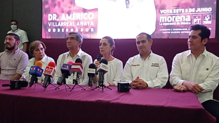 En conferencia de prensa, este domingo por la tarde, y acompañada por el candidato a la gubernatura del estado por Morena, PVEM y PT, Sheinbaum hizo un llamado para que en Tamaulipas se fortalezca la democracia y se respete la voluntad popular.