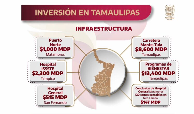 Agregó que también se destinan mil millones de pesos invertidos en el dragado del Puerto del Norte en Matamoros, mientras que en la zona sur del estado se construye el nuevo Hospital Regional de Alta Especialidad del ISSSTE en Tampico con una inversión de 2 mil 300 millones de pesos y en San Fernando se construye el nuevo Hospital General, invirtiendo 515 millones de pesos.