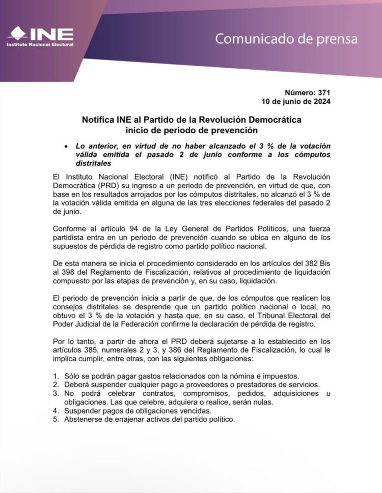 Notifica INE Mexico al Partido de la Revolución Democrática inicio de periodo de prevención.