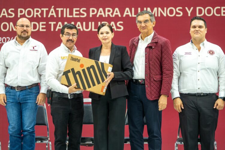 En un acto histórico, el gobernador Américo Villarreal Anaya y el rector Dámaso Anaya Alvarado realizaron la entrega simbólica de más de cinco mil equipos de cómputo portátil para estudiantes y docentes de la Universidad Autónoma de Tamaulipas (UAT).