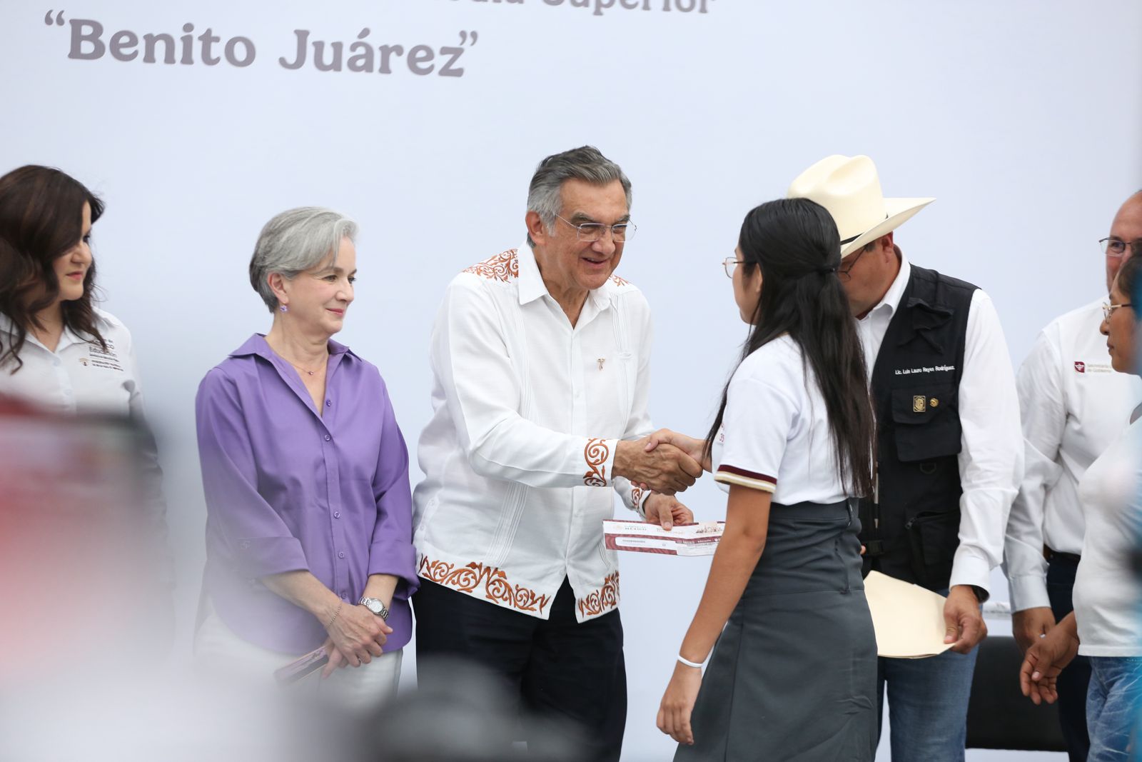Al acompañar al delegado de Bienestar Federal, Luis Lauro Reyes Rodríguez, a la ceremonia de entrega de tarjetas de la Beca Universal de Educación Media Superior «Benito Juárez» a más de 300 alumnos de este municipio, y junto con la doctora María de Villarreal, presidenta del DIF Estatal, el gobernador destacó que gracias al apoyo de la presidenta Claudia Sheinbaum, Tamaulipas recibe más de 20 mil millones de pesos a través de los programas sociales.