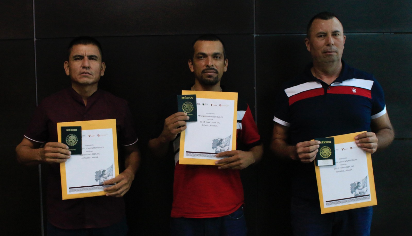 En un acto encabezado por el secretario del Trabajo, Luis Gerardo Illoldi Reyes, acompañado por la subsecretaria de Empleo y Previsión Social, Carolina Iveth Martínez Molano, se hizo entrega de tres sobres de viaje a trabajadores tamaulipecos del giro agrícola que fueron contratados formalmente por la empresa canadiense OBEID Farms 2014, INC. para laborar durante un periodo de 24 meses.