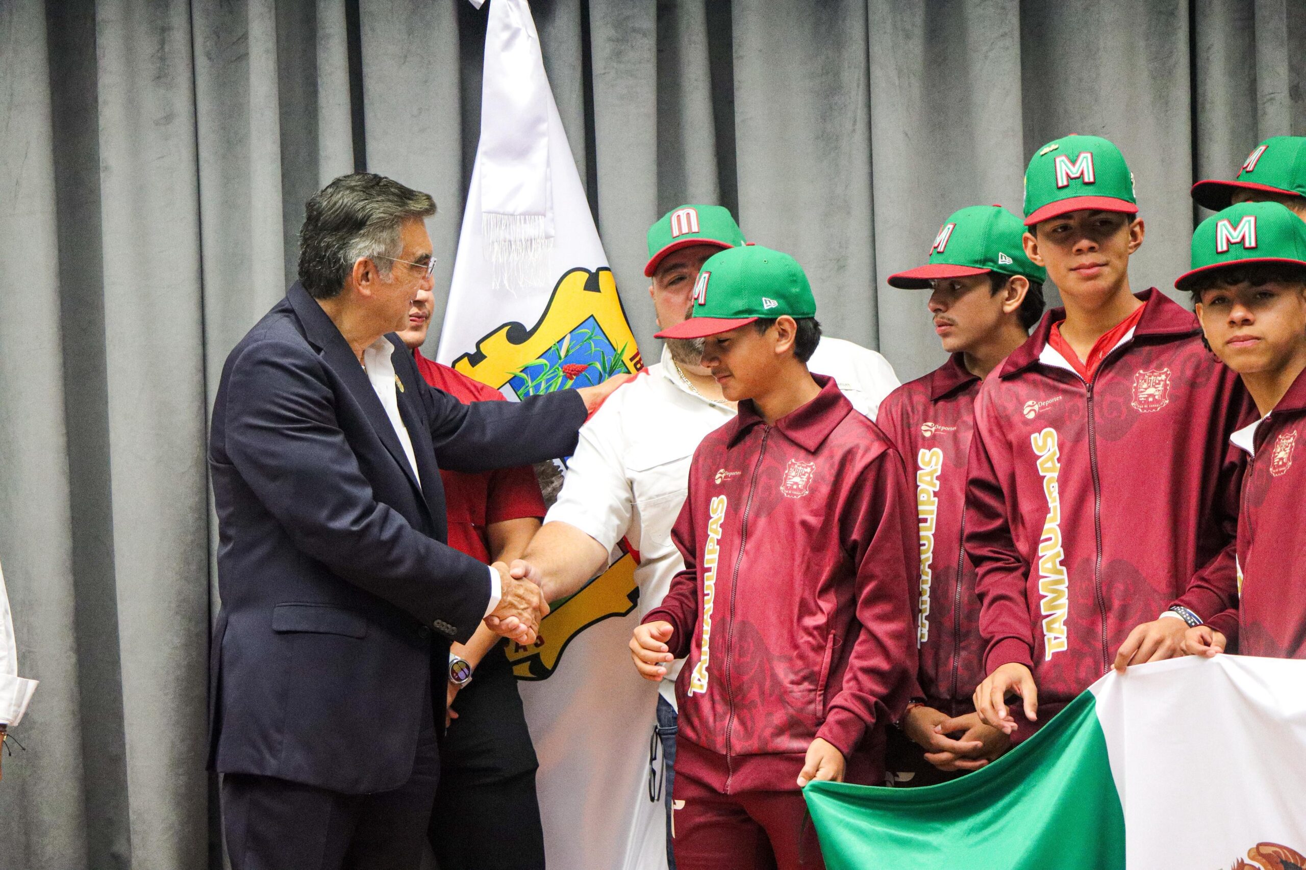 Ciudad Victoria, Tamaulipas.- El gobernador de Tamaulipas, Américo Villarreal Anaya, encabezó la ceremonia de abanderamiento del equipo de la Liga Villa del Refugio de Matamoros A.C., escuadra campeona nacional de la categoría Junior, perteneciente al programa oficial de Little League (Williamsport) y con ello dicho equipo representará a México en el Torneo Latinoamericano, a celebrarse en Guatemala a partir del próximo sábado.