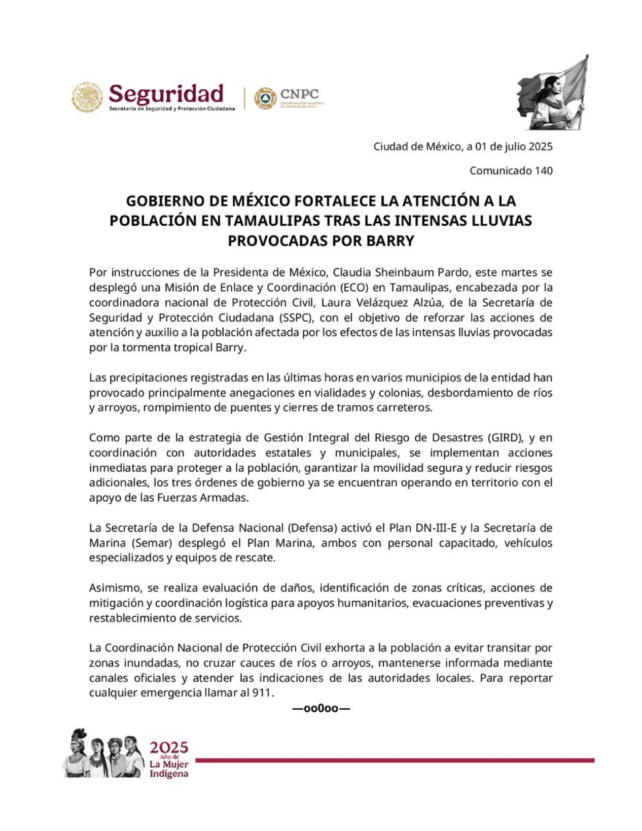 Ante lluvias respalda gobierno federal a Tamaulipas
