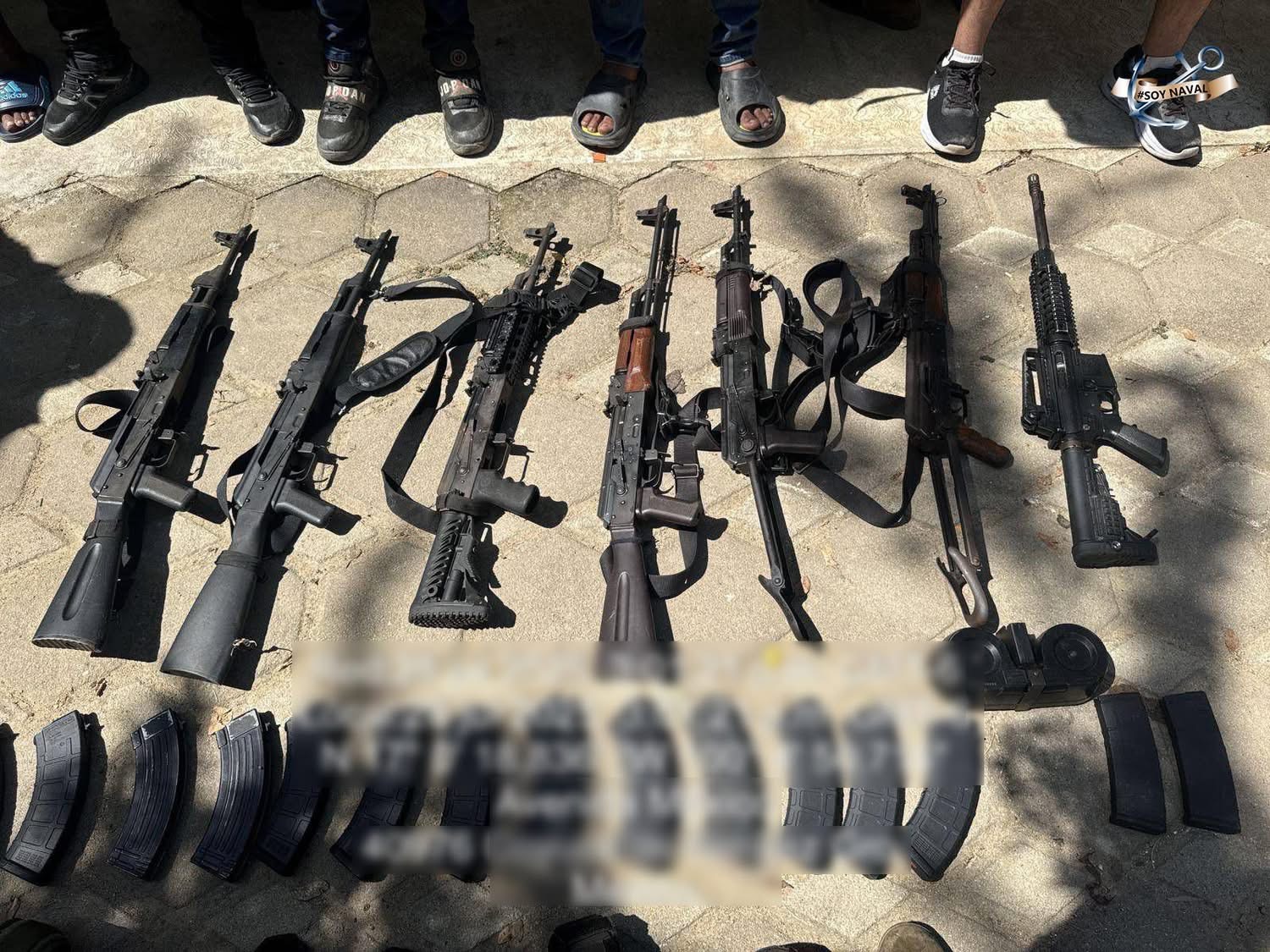 Lo anterior se llevó a cabo durante un recorrido de disuasión y vigilancia efectuado por personal de Infantería de Marina, con apoyo de un helicóptero Black Hawk para efectuar el reconocimiento y cobertura en el área de operaciones, lo que dio como resultado la detención de siete hombres. Asimismo, se aseguraron siete fusiles, 16 cargadores, un magazín (para almacenamiento de municiones), un chaleco táctico con placas, tres chalecos adicionales sin placas, tres pecheras tácticas, 188 dosis de marihuana y cuatro motocicletas.