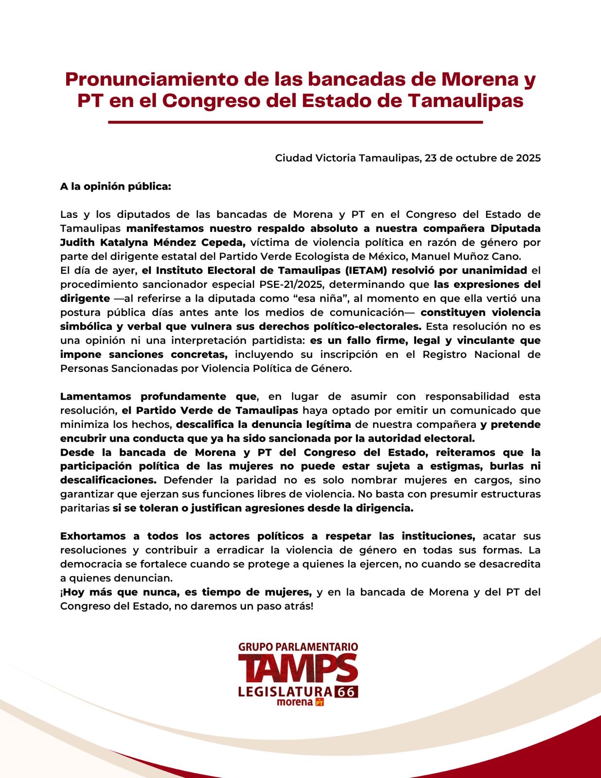 Morena y PT respaldan a diputada y piden respetar fallo del IETAM por violencia política de género