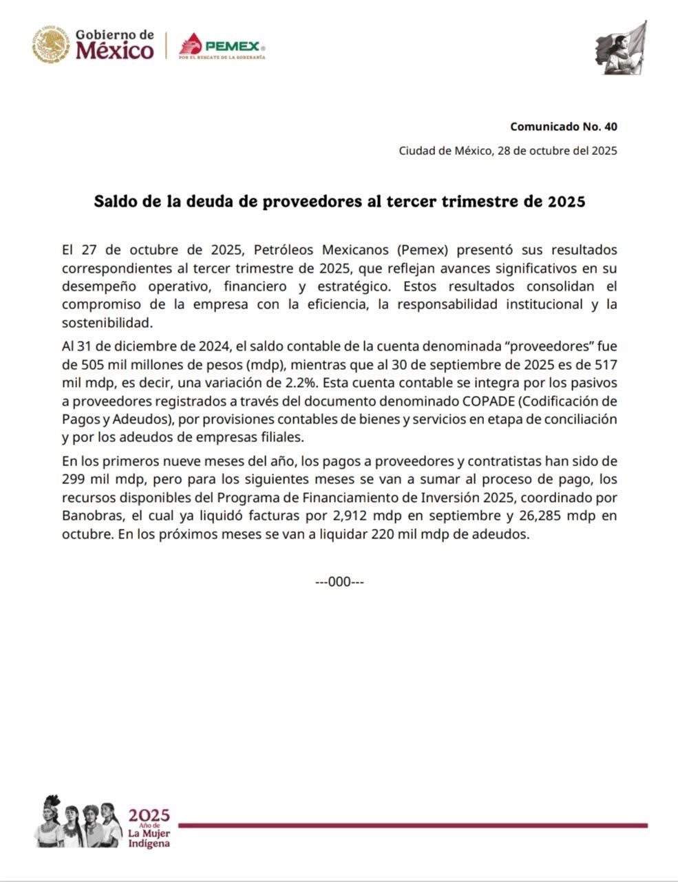 Pemex informa Saldo de la deuda de proveedores al tercer trimestre de 2025