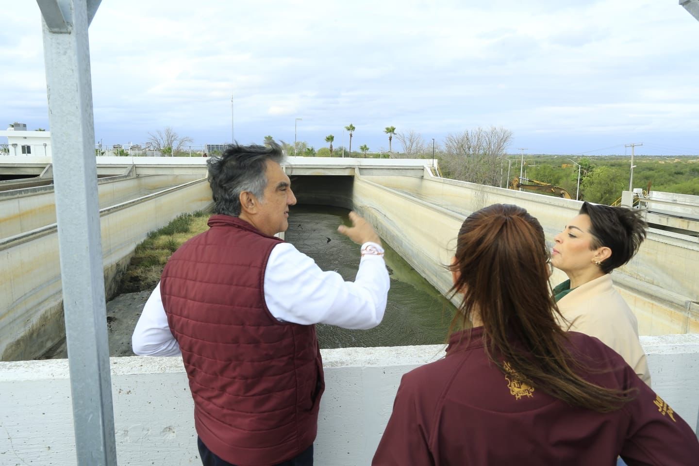 Acompañado por la presidenta municipal, Carmen Lilia Canturosas, el gobernador escuchó la explicación del secretario de Recursos Hidráulicos, Raúl Quiroga Álvarez, quien presentó los avances de la obra, que junto con la Planta Oradel y la Planta Norponiente logrará tratar el 100 por ciento de las aguas residuales de la ciudad, para colaborar en el saneamiento del río Bravo.
