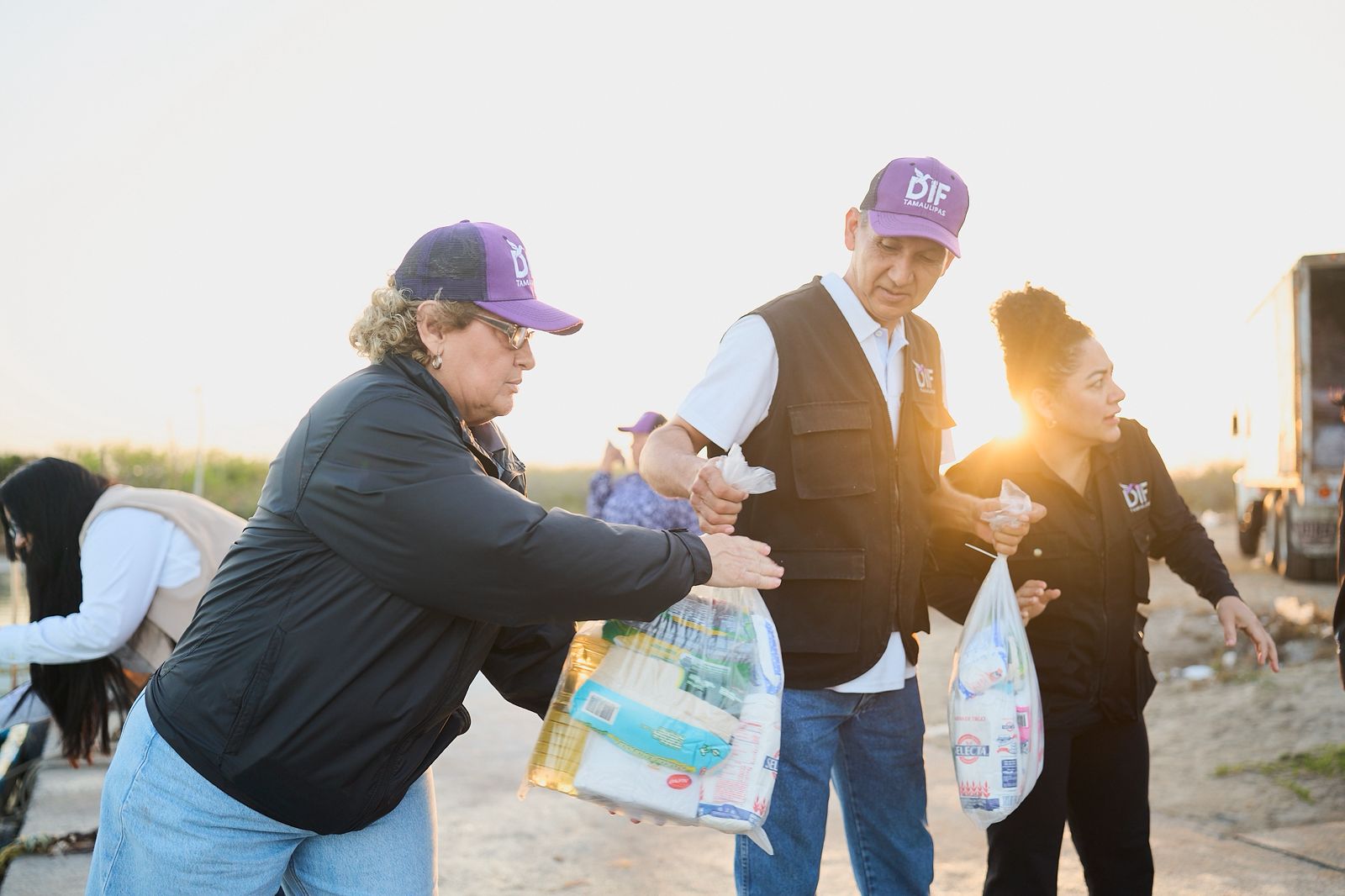 Matamoros, Tamaulipas.– Las y los Mensajeros de Paz del Sistema DIF Tamaulipas, que preside la doctora María de Villar real, regresaron al ejido Higuerillas para cumplir los compromisos asumidos y entregar más de dos mil apoyos a familias de la comunidad, así como de las islas aledañas.